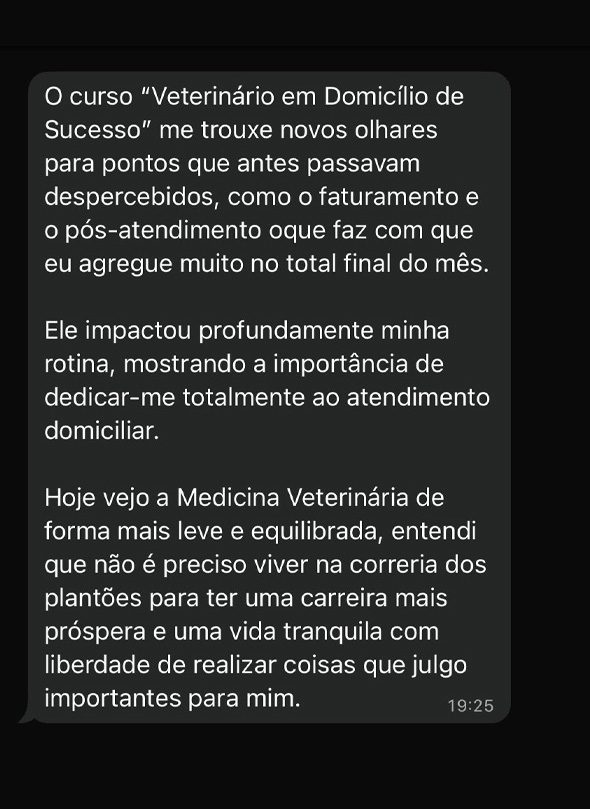 “Em menos de 6 meses, saí dos plantões intermináveis e comecei a faturar mais de R$15 mil por mês com atendimentos domiciliares. Hoje tenho tempo para mim e para minha família. Essa formação mudou completamente minha forma de enxergar a veterinária.”