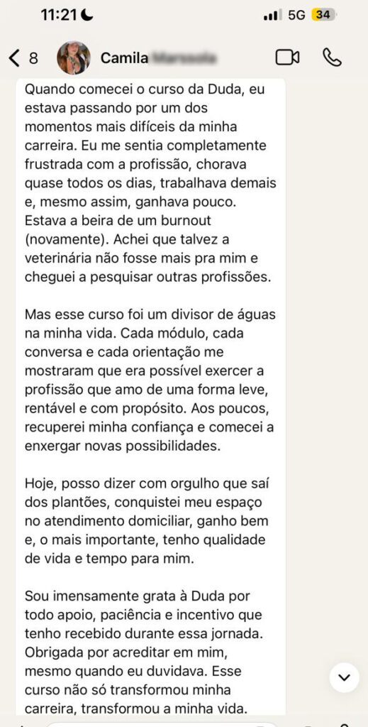 Hoje, tenho orgulho de dizer que já ajudei dezenas de veterinárias a viverem essa mesma transformação, alcançando liberdade, reconhecimento e faturamentos consistentes a partir de 15 mil por mês. E é isso que quero mostrar para você: existe, sim, um caminho mais leve e recompensador dentro da veterinária.